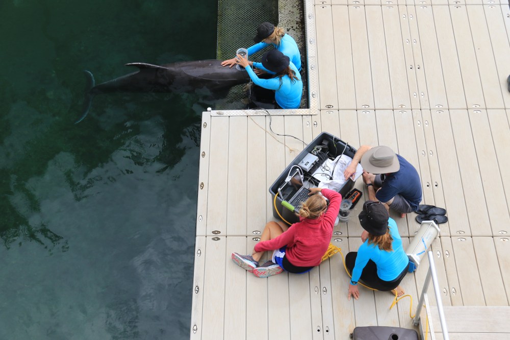The team works closely with Dolphin Quest’s marine mammal specialists to make the data collection process enriching and fun for the animals. “It’s all been accomplished through positive reinforcement,” says Julie Rocho-Levine, Dolphin Quest’s Manager of Marine Mammals. “Basically, we take our desired end behavior and break it down into small achievable steps for the dolphins. It’s like teaching them to play a new game. Our training philosophy is based on trust, respect, creativity and kindness.”