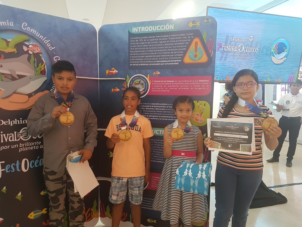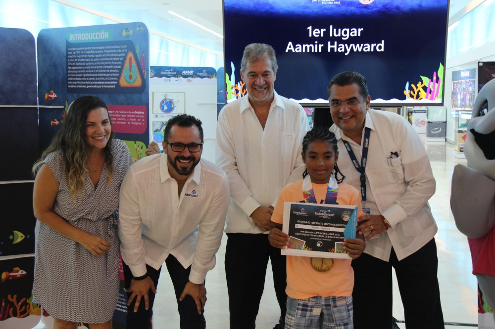 Pictured above from left to right: Mrs. Ivonne Avila, Director of Outreach and Environmental Education of the Municipality of Benito Juárez, on behalf of the Municipal President of Benito Juárez, Lic. Mara Lezama Espinosa, Mr. Rodrigo Constandse Córdova, CEO of Delphinus, Mr. Alfredo Arellano Guillermo, Secretary of Ecology and Environment of Quintana Roo, representing the Governor of the Quintana Roo State, Carlos Joaquín González, Aamir Hayward, winner of the first place international category of the Festival of the Oceans’ Drawing Contest, Mr. Alejandro Rosel Ramírez, Institutional Relationship Manager of ASUR